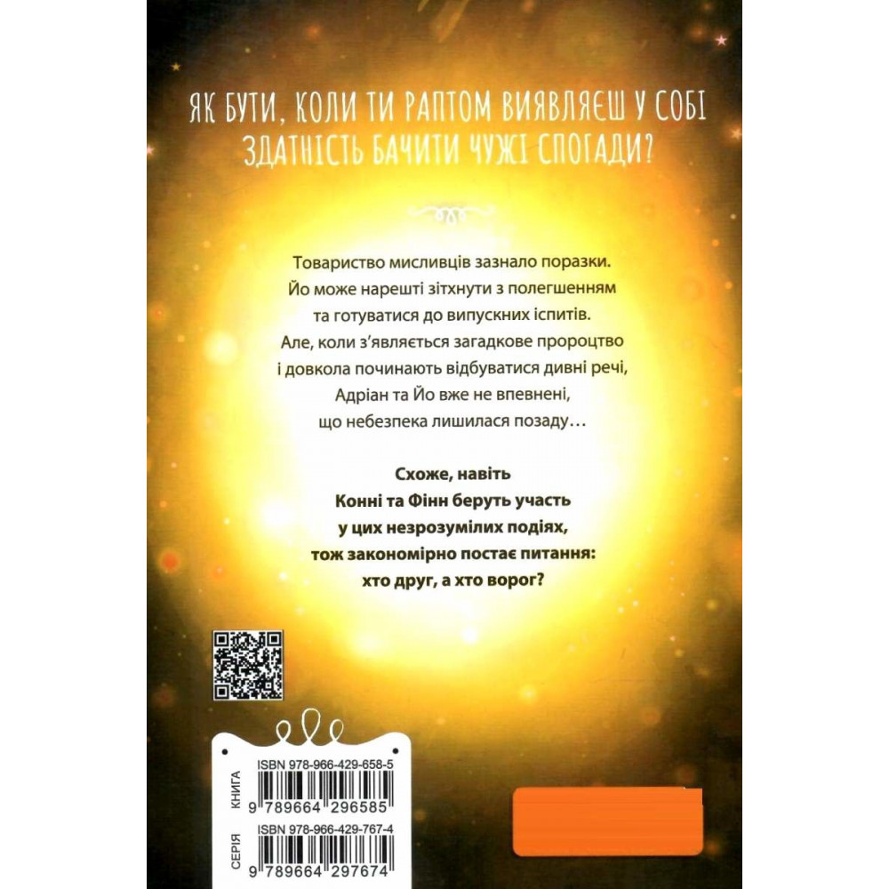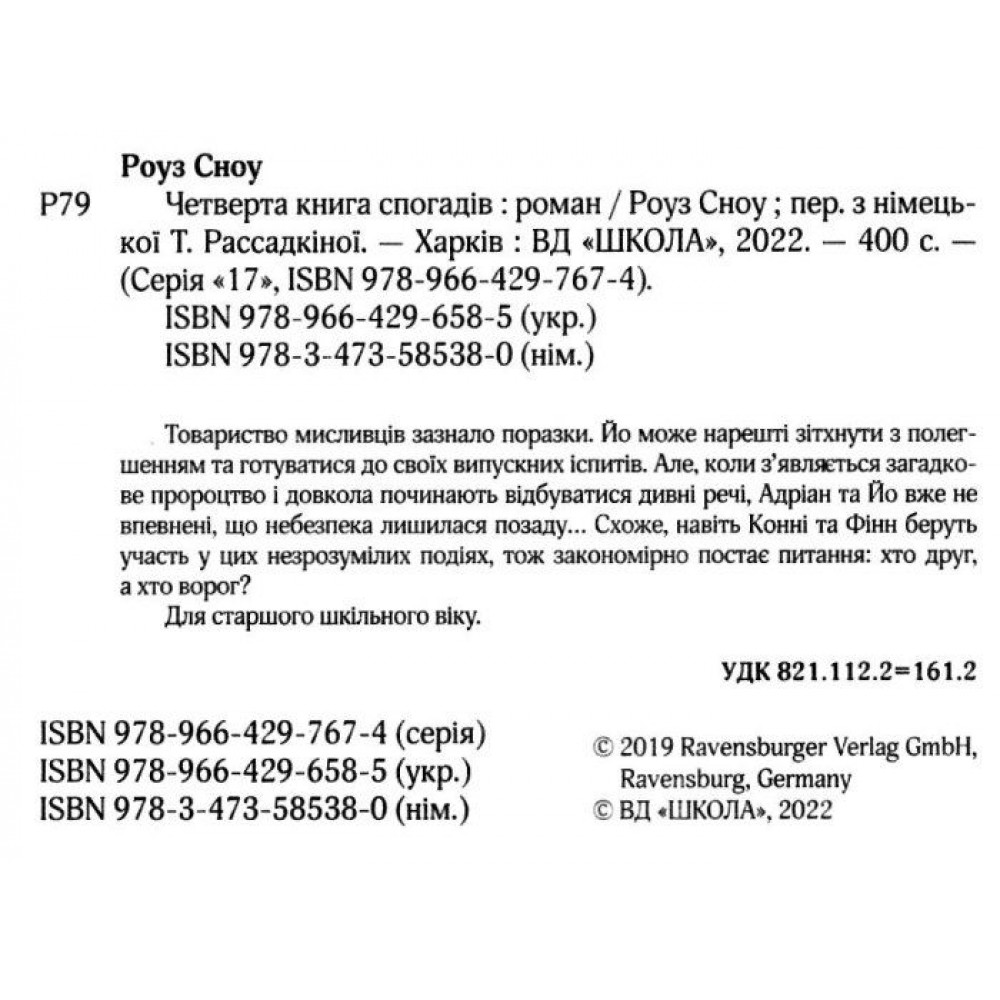 Заключний том тетралогії «17» Роуз Сноу змусить читача неабияк дивуватись. Знайомі кожному підлітку-абітурієнту переживання відносно майбутньої професії та хоча б якихось уявлень про своє призначення у цьому світі підсилюватимуть нові подробиці протистояння ясновидиць та мисливців.У кімнаті колишнього голови загону мисливців Маріуса ясновидиці знаходять потаємну кімнату.А в ній щоденник Сапфіри, прабабусі головної героїні. Той щоденник оповідає нове пророцтво, яке ставить під загрозу долю усього товариства ясновидиць. «У давніх книжках згадуються діти, які можуть бачити майбутнє, впливати на думки або змінювати час».Мало було Йо мисливців, так на додачу ще й діти? Якщо найголовнішою інтригою попередніх частин був ключ часу, що його полювали загони ворогів, то «Четверта книга спогадів» оповідає нову загадку.Хто вони ці обдаровані надлюдським здібностями діти індиго?
