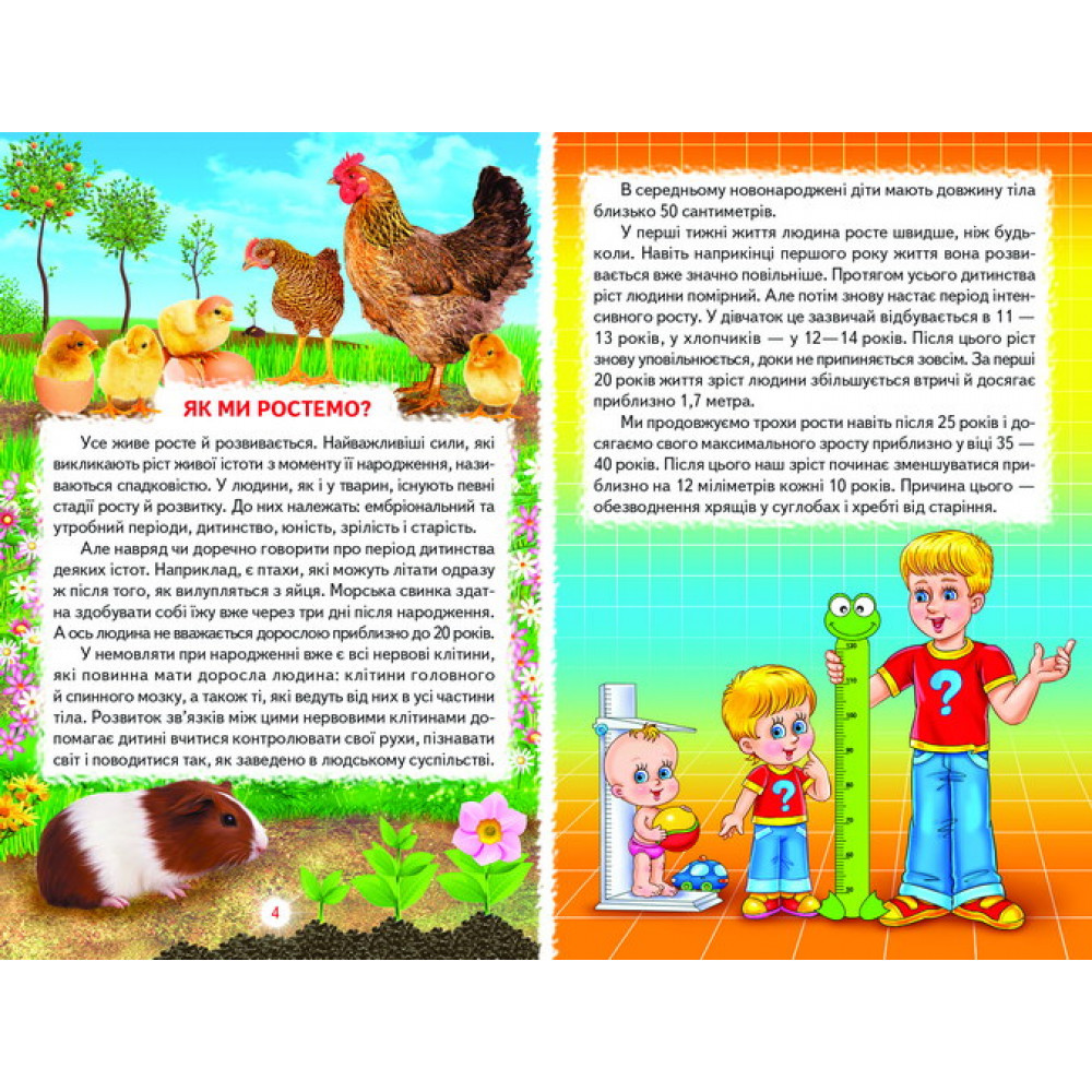 Ця книжка розповість юним допитливим читачам про дивовижні властивості людського організму, його будову і можливості, а також відповість на багато цікавих запитань: «Як ми ростемо?», «Чому у людей таке різне волосся?», «Як ми запам’ятовуємо?», «Чому ми потіємо?», «Як ми розрізняємо кольори?» тощо.
