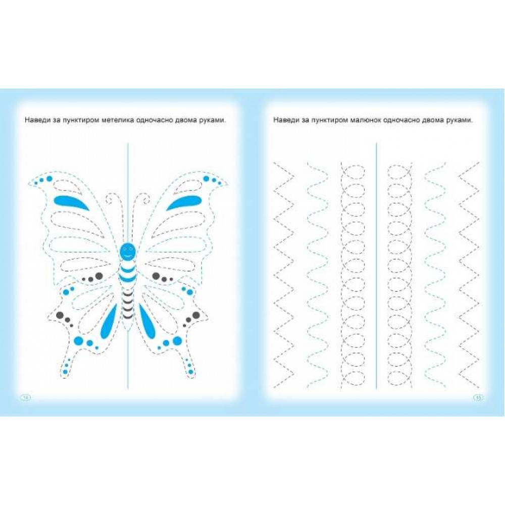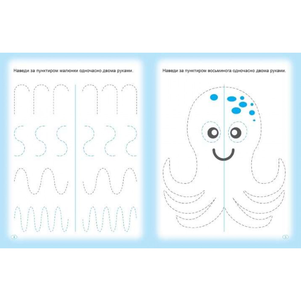 Прописи допоможуть дитині навчитися впевнено тримати олівець та одночасно розвивати обидві півкулі мозку завдяки письму двома руками. У книжці запропоновано ілюстрації, які треба навести одночасно лівою та правою руками. Такий вид малювання сприймається як розвага, а не як заняття. Завдяки таким тренуванням дитина підвищить рівень розподілу уваги і буде більш успішно навчатися. Прописи упорядковані згідно з методичними рекомендаціями щодо підготовки руки до письма.