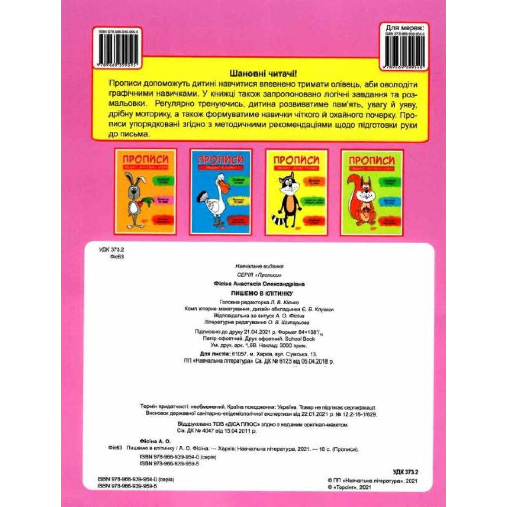 Прописи допоможуть дитині навчитися впевнено тримати олівець, аби оволодіти графічними навичками. У книжці також запропоновано логічні завдання та розмальовки. Регулярно тренуючись, дитина розвиватиме пам'ять, увагу й уяву, дрібну моторику, а також формуватиме навички чіткого і охайного почерку. Прописи упорядковані згідно з методичними рекомендаціями щодо підготовки руки до письма.